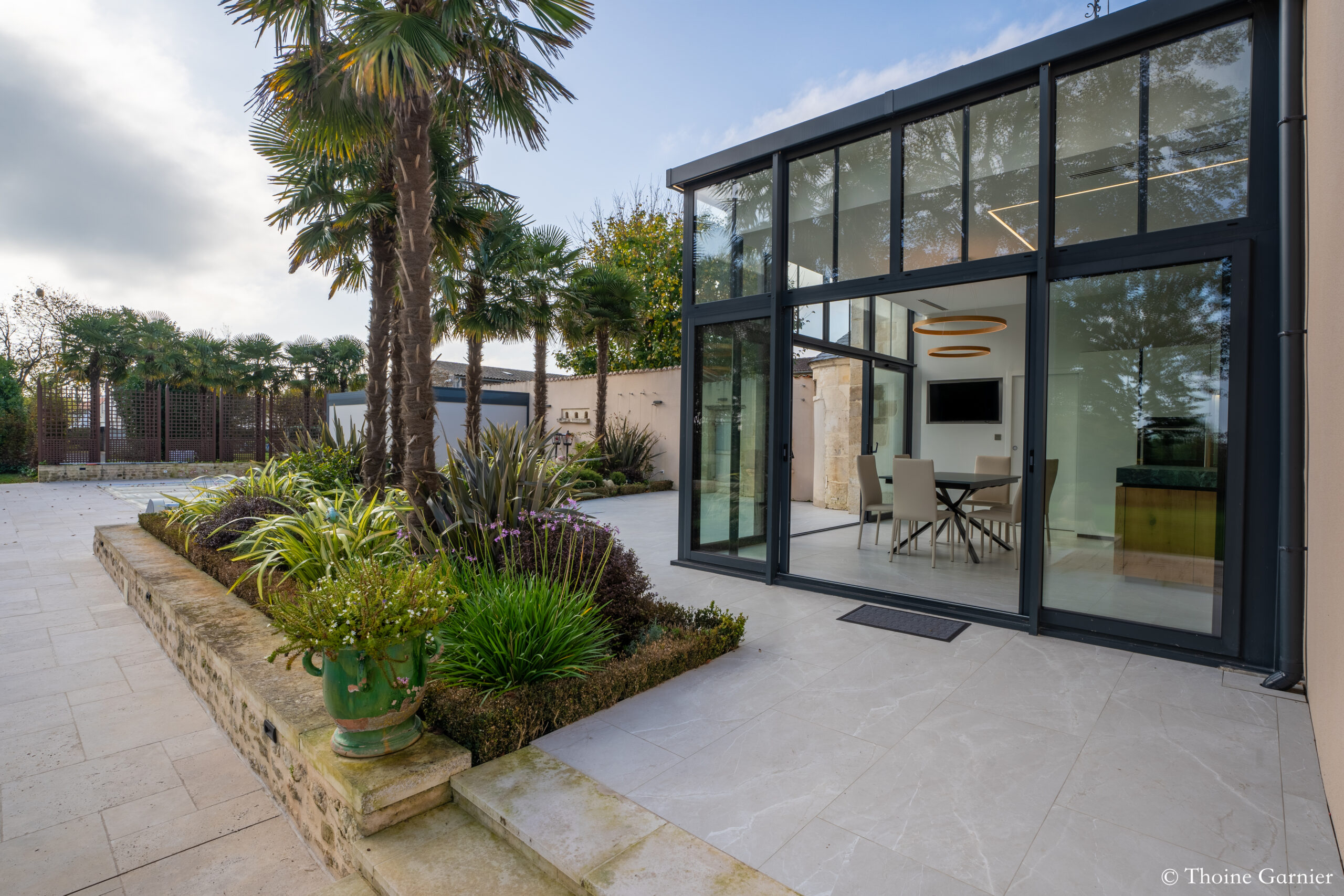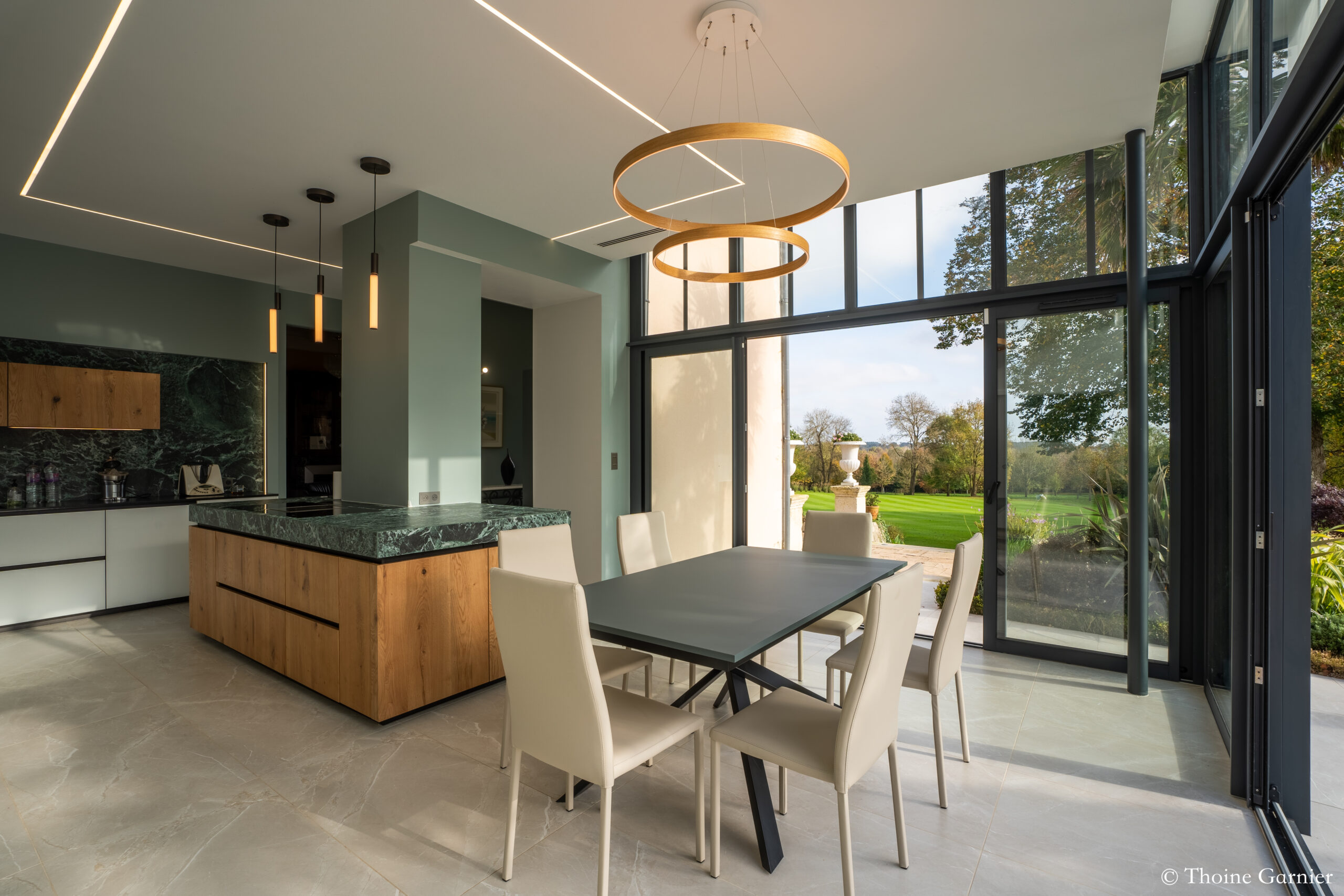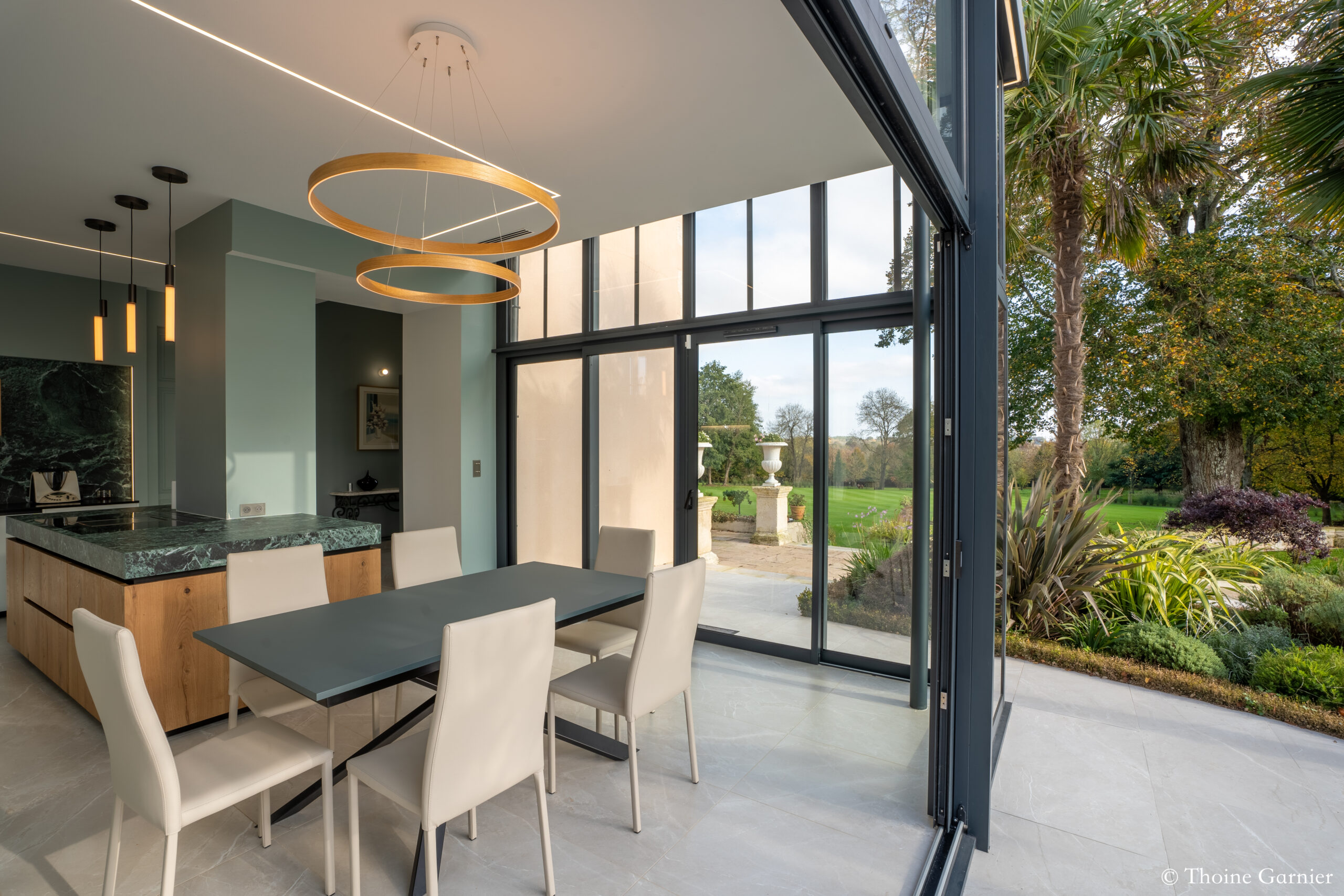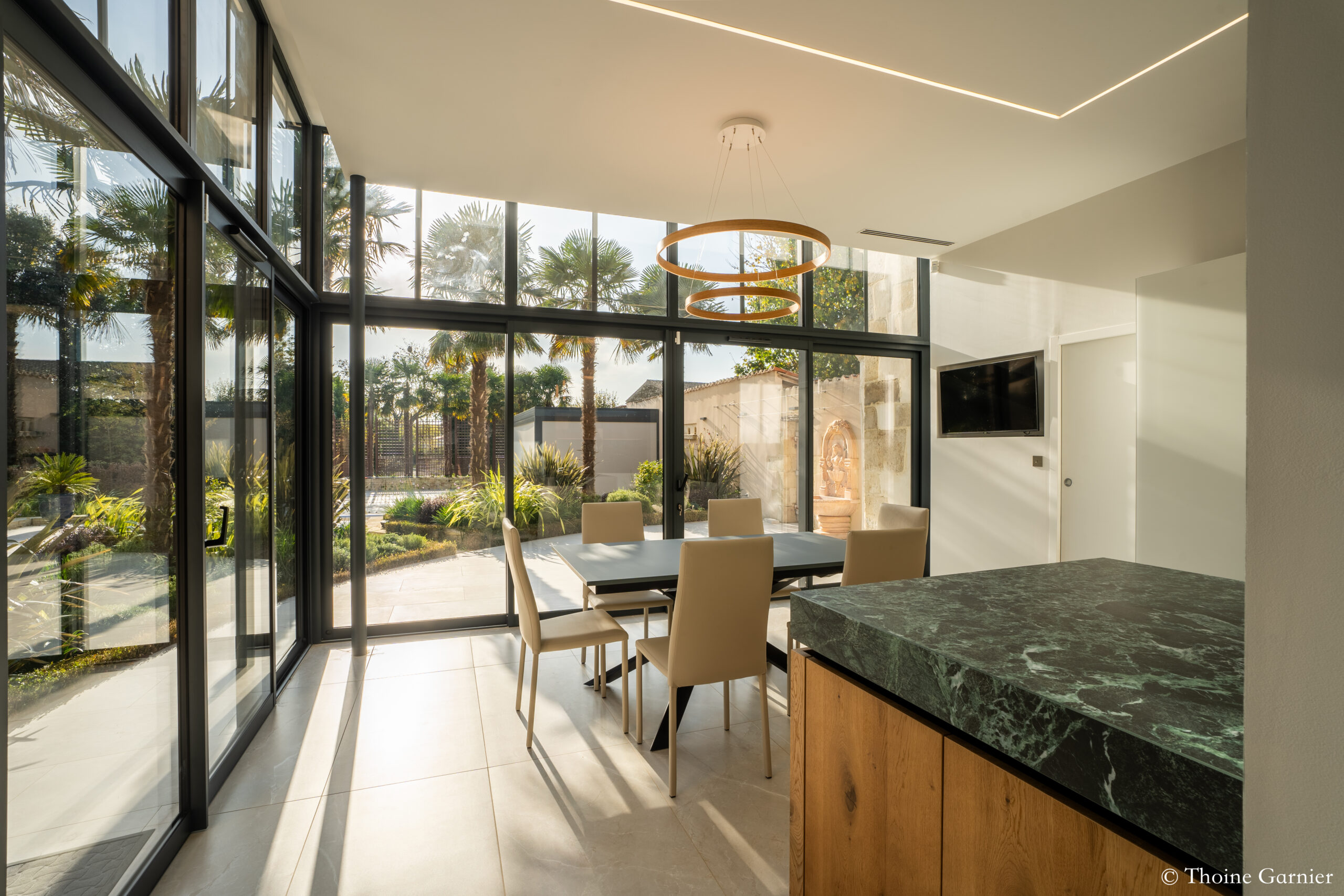 Extension minimaliste grande hauteur pour une cuisine. Grande hauteur avec plafond suspendu pour profiter de l’extérieur en toutes saisons.