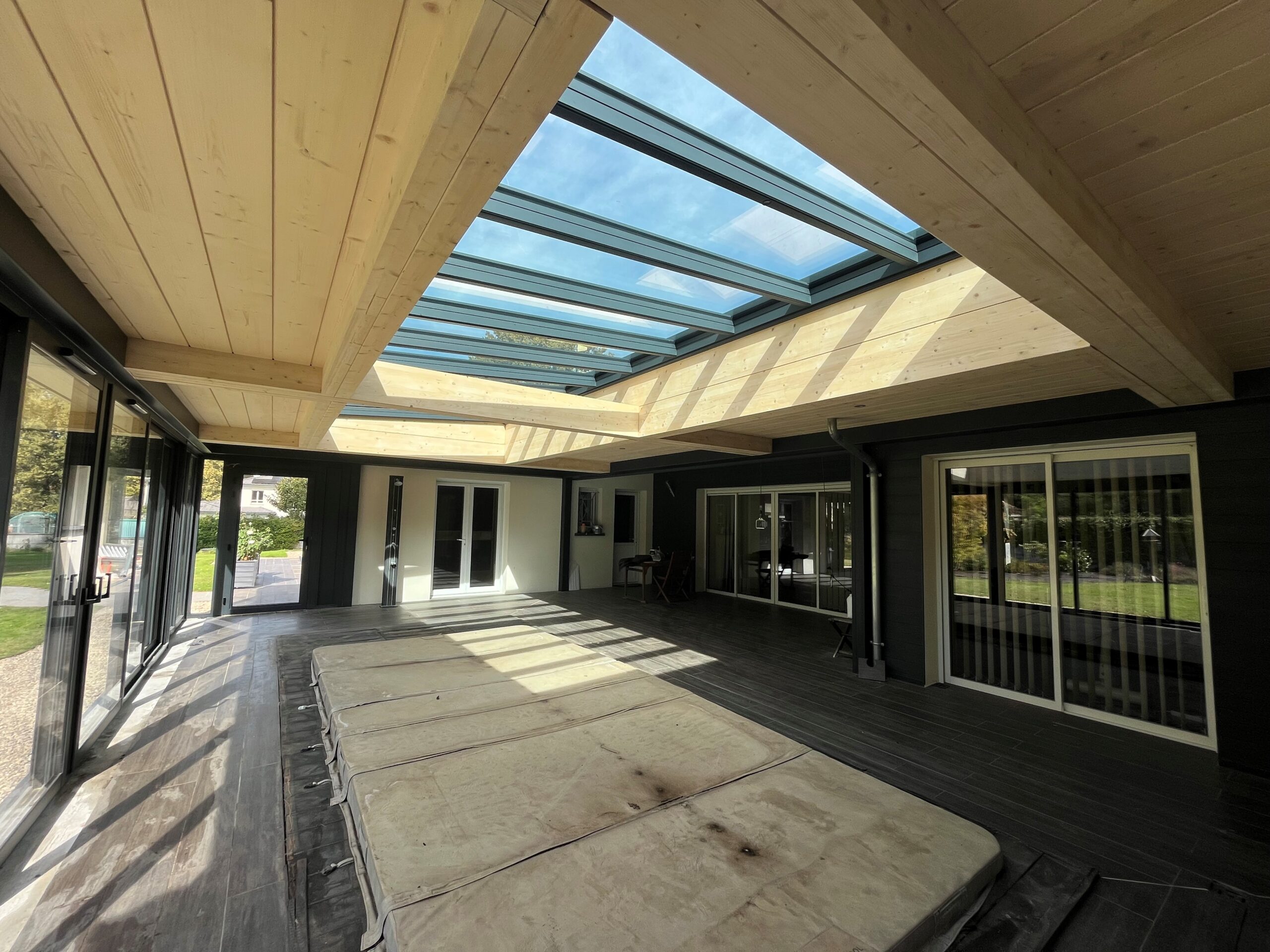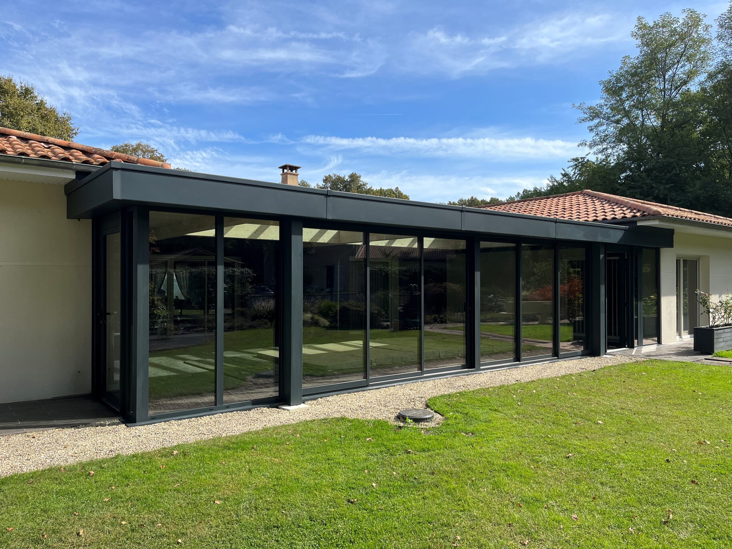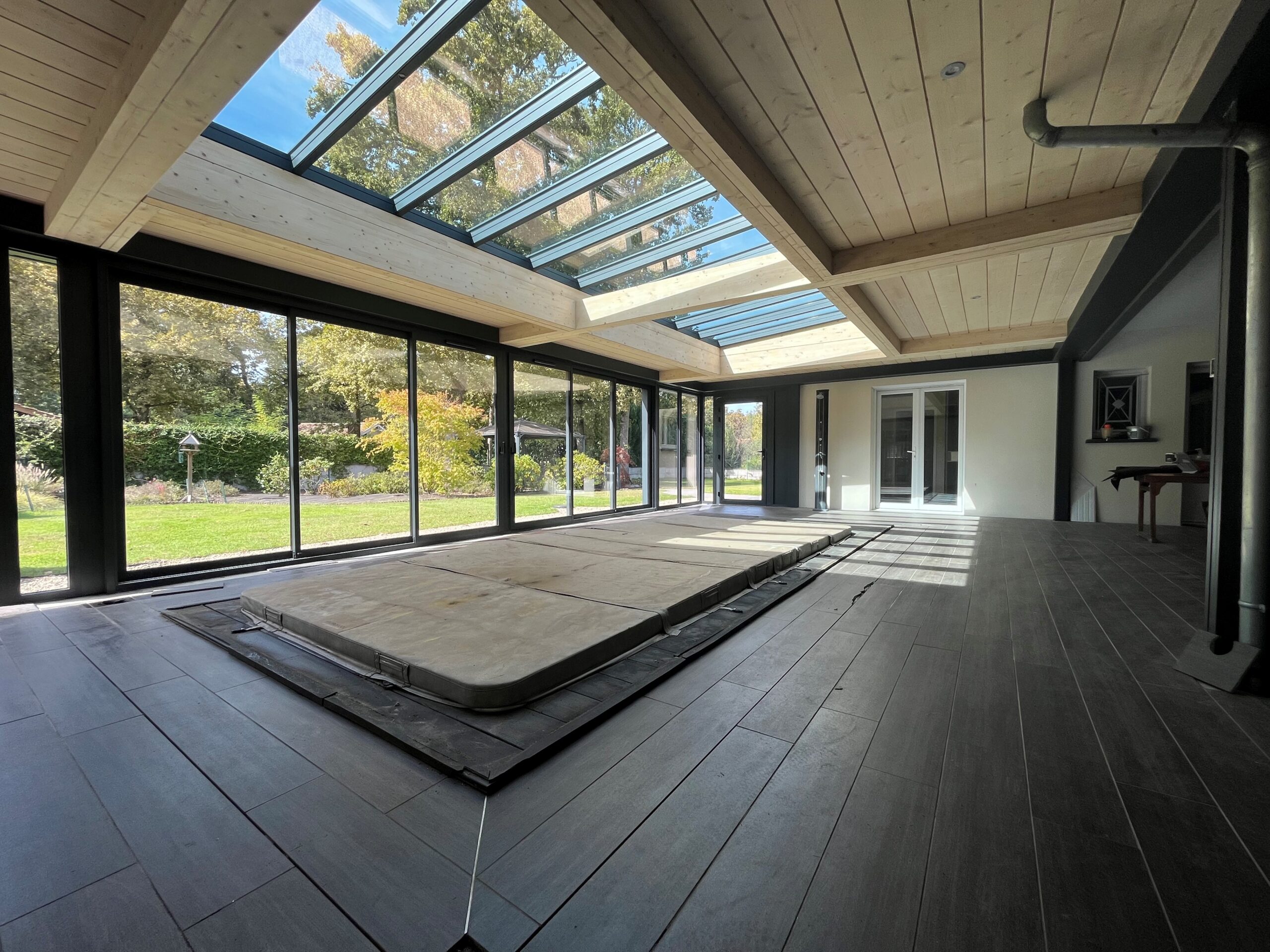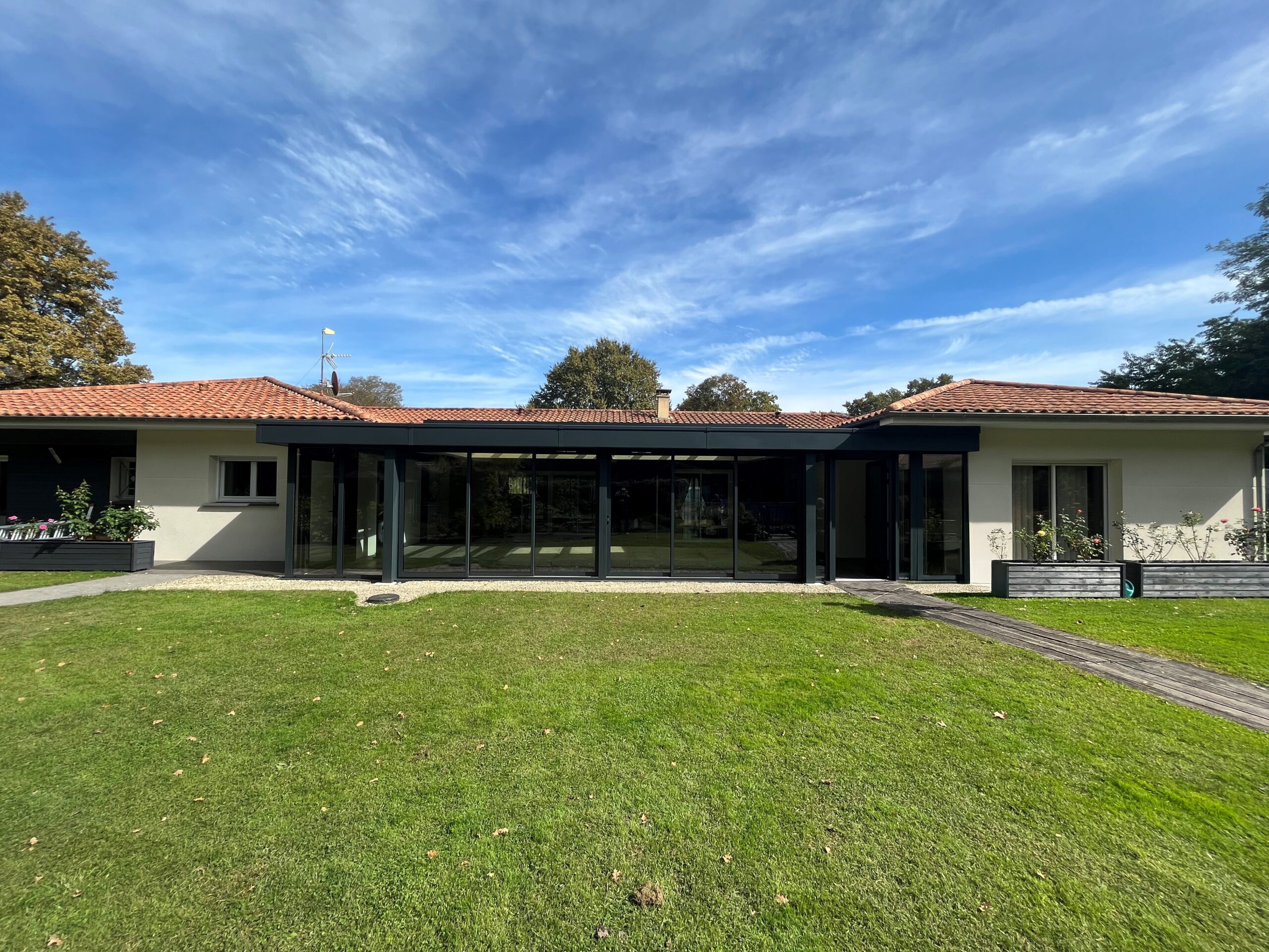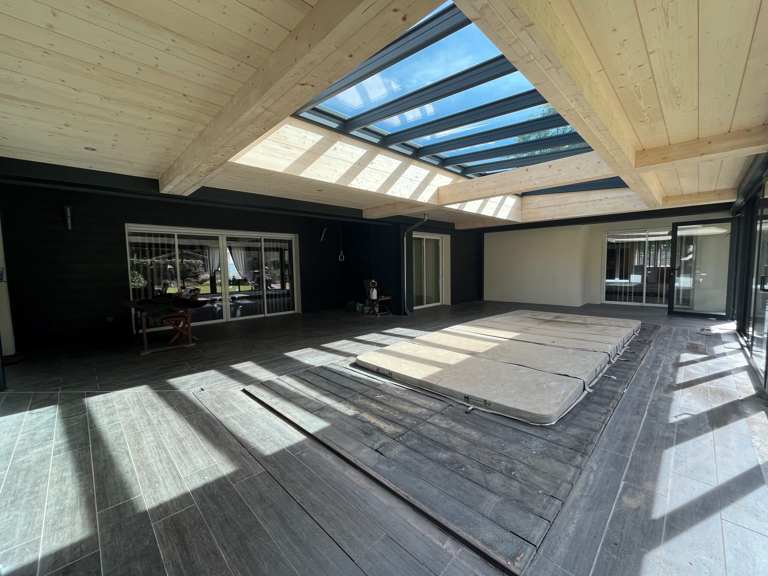 Création d’une extension pour un espace de vie abritant une piscine à Bordeaux. Intégration d’un puit de jour avec vitrage contrôle solaire. Accès PMR.