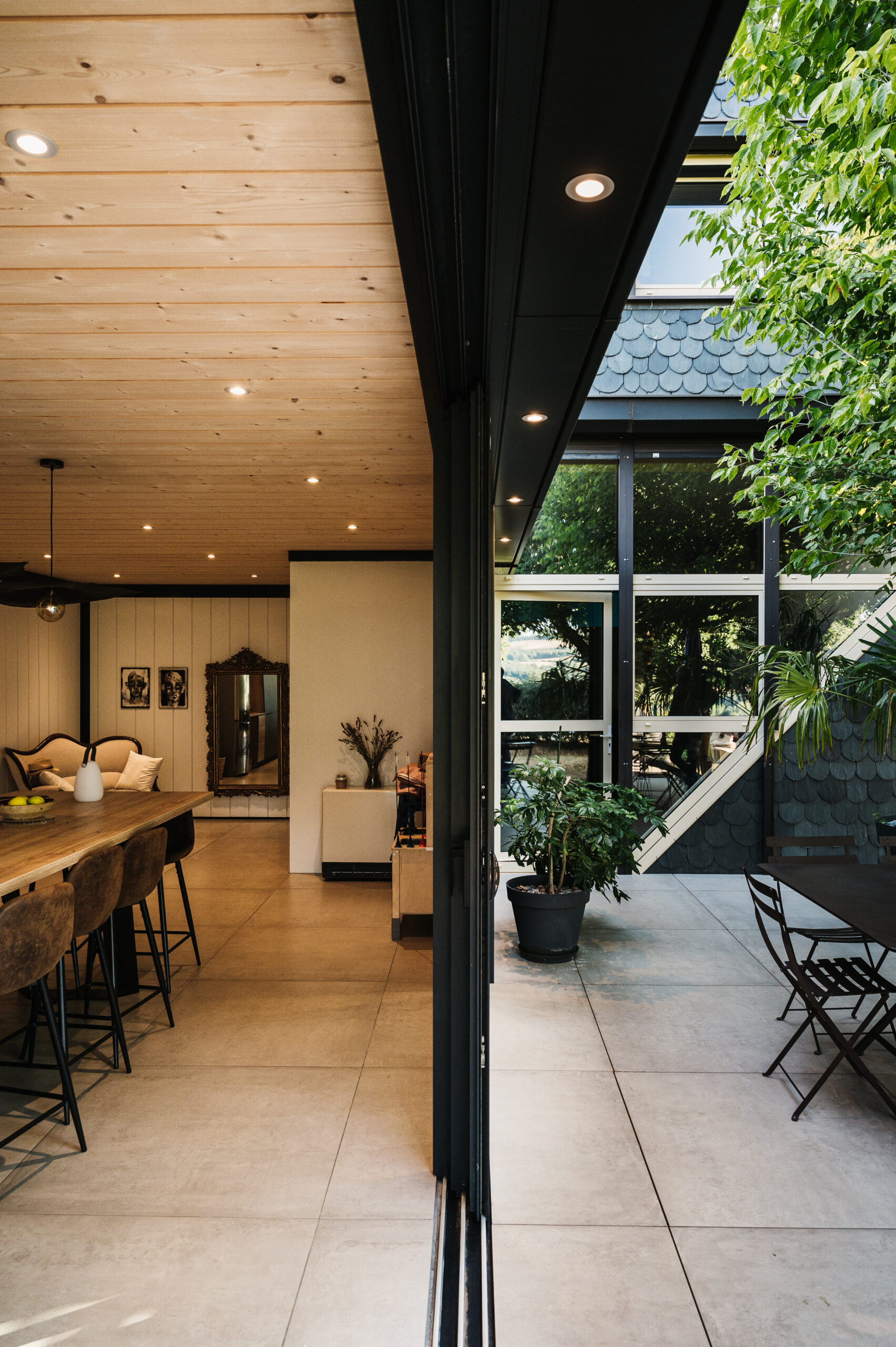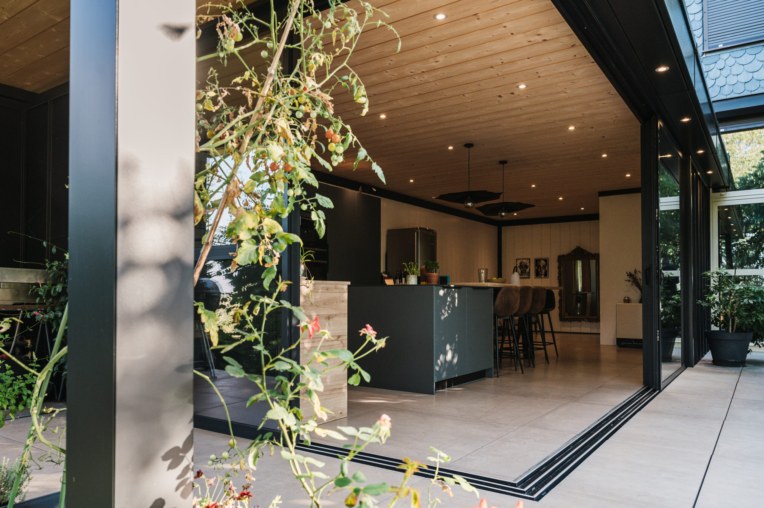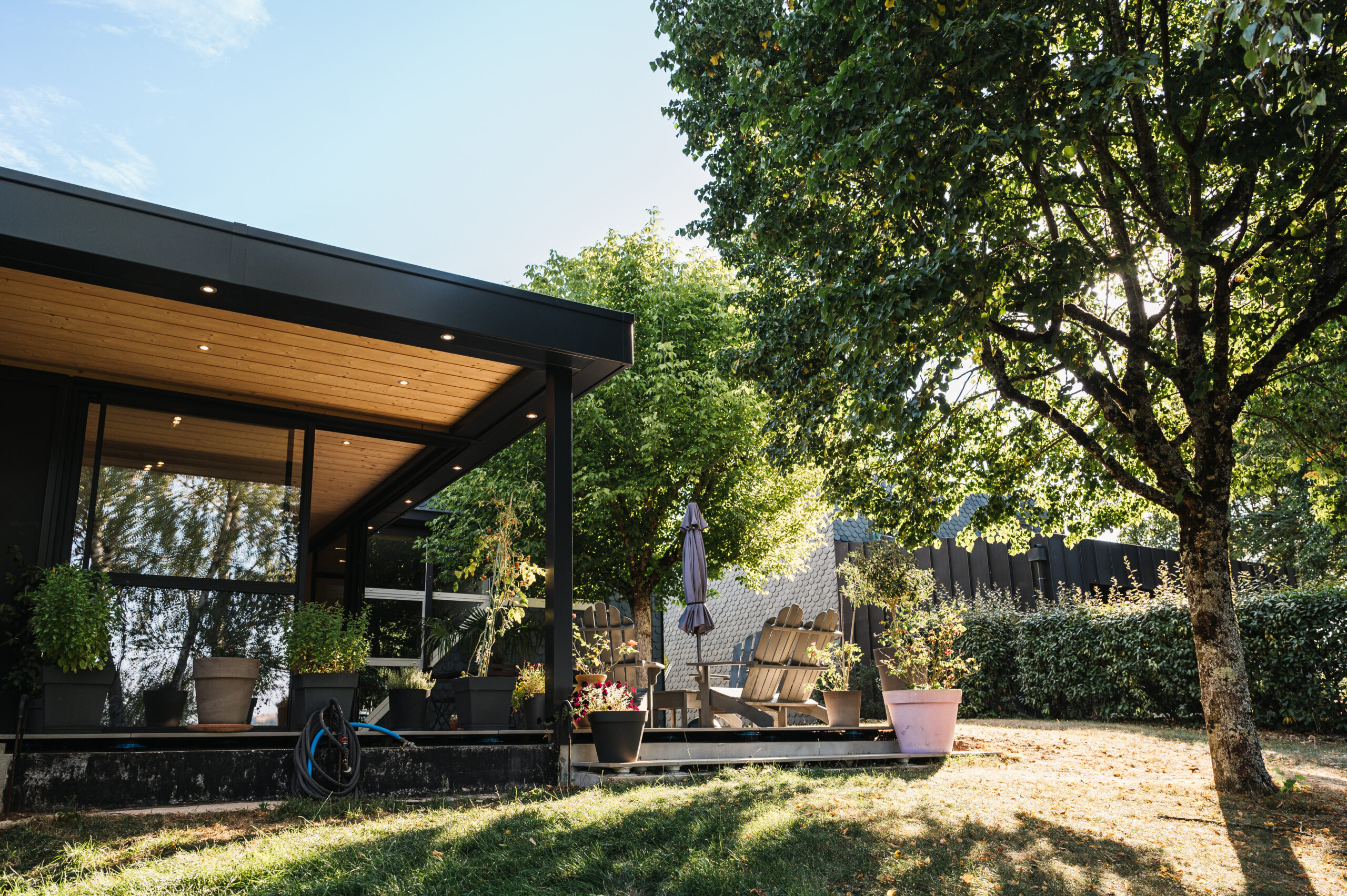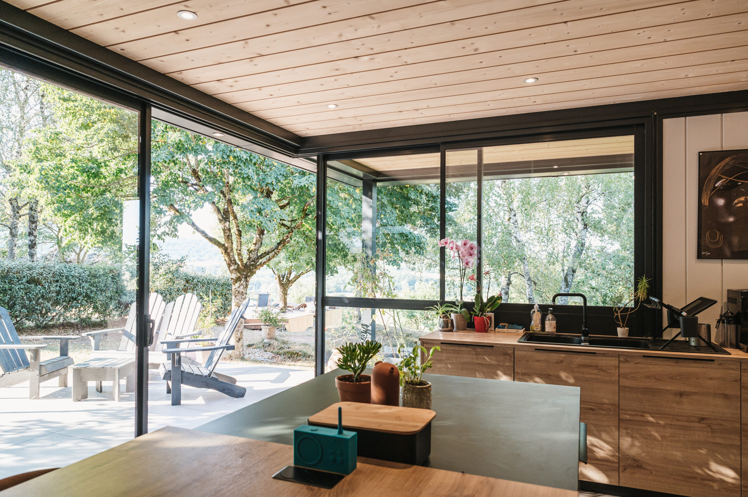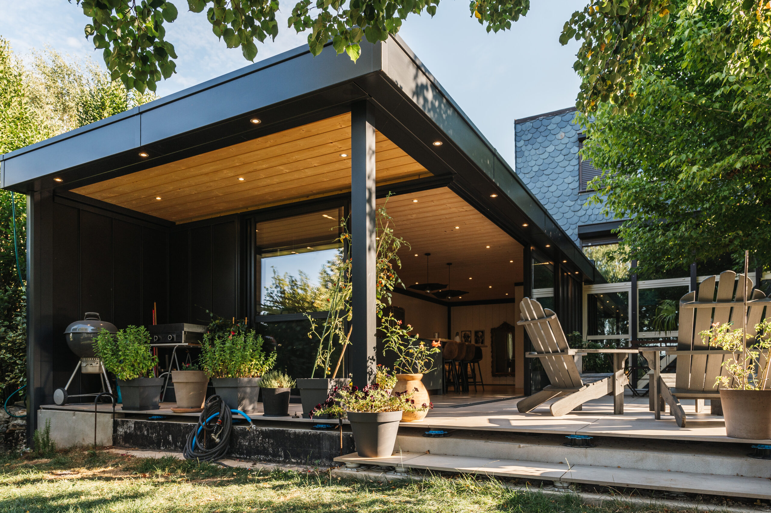 Extension d’un espace cuisine avec une avancée de toit pour profiter de l’extérieur en toutes saisons.