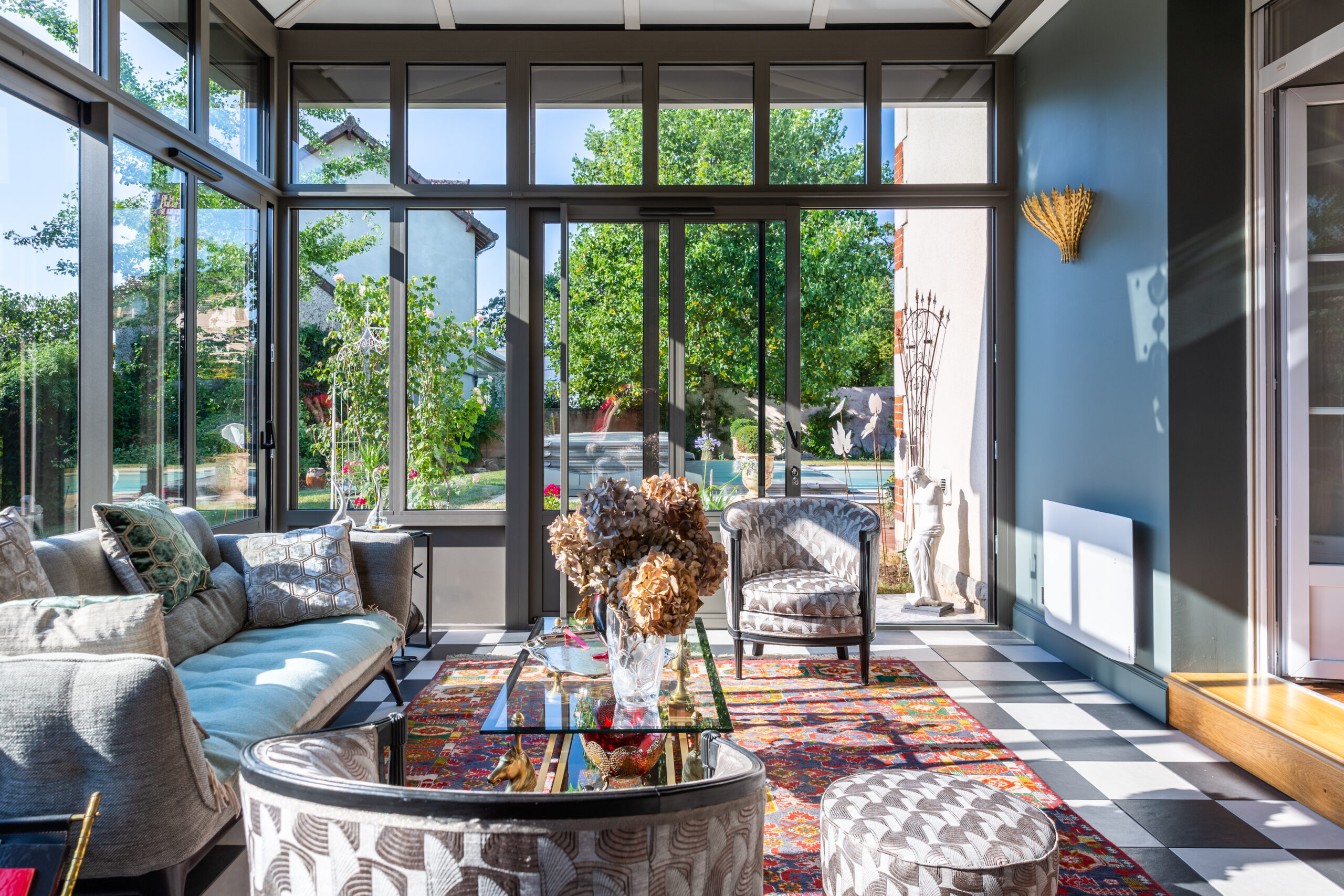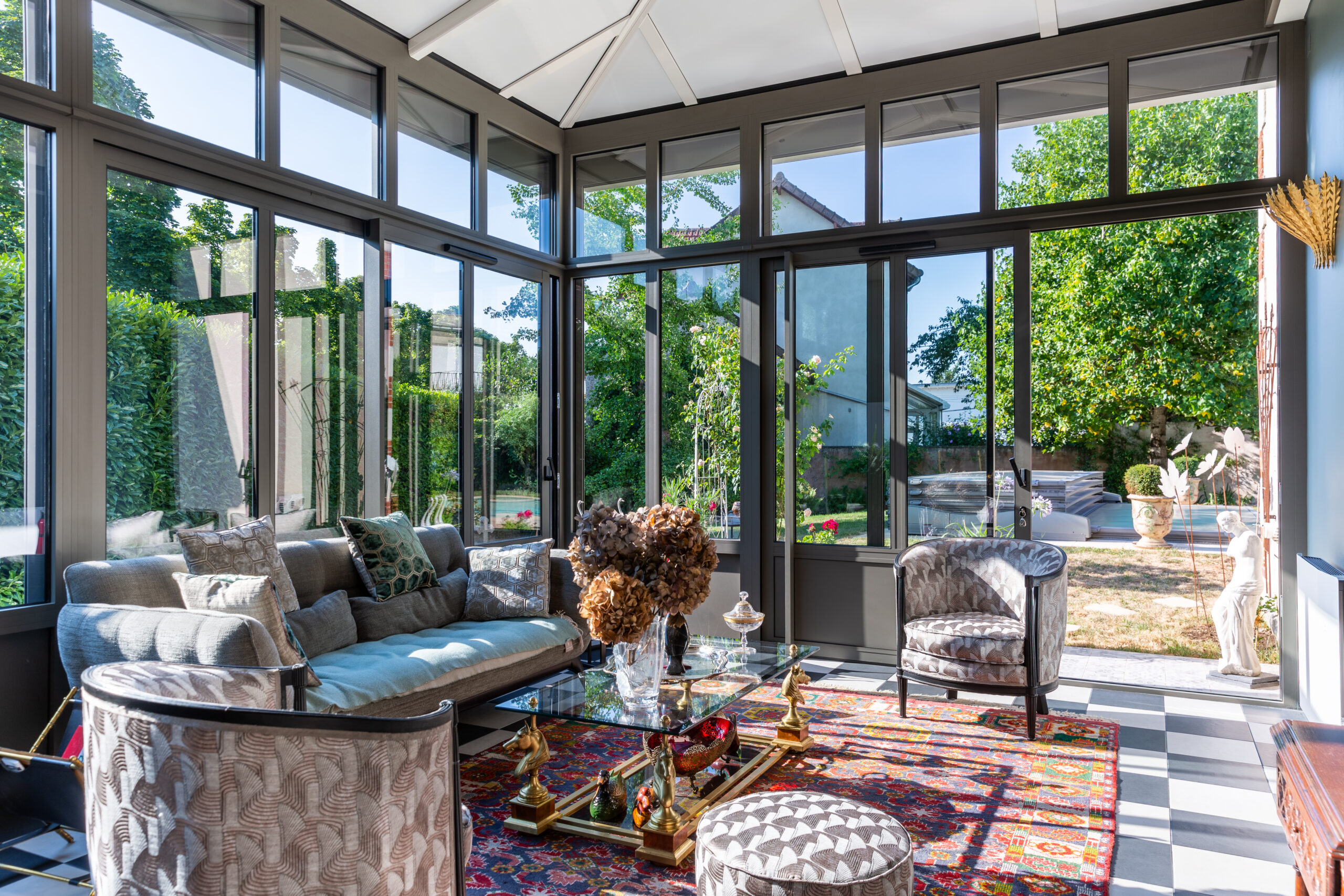 Chassis impost pour une plus grande hauteur, toiture isolante, ossature couleur taupe.