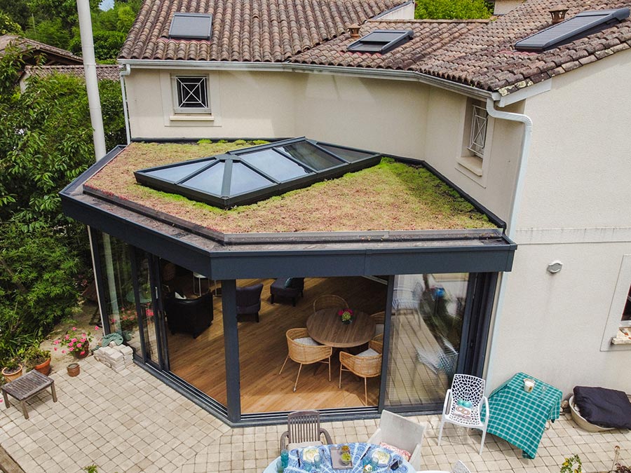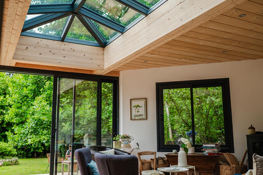 Notre équipe leur a proposé une extension en aluminium avec ossature bois apparente et une verrière zénithale sur mesure, conçue pour apporter un maximum de lumière naturelle. L’ensemble est couvert par une toiture plate végétalisée, qui allie performance thermique et intégration paysagère.