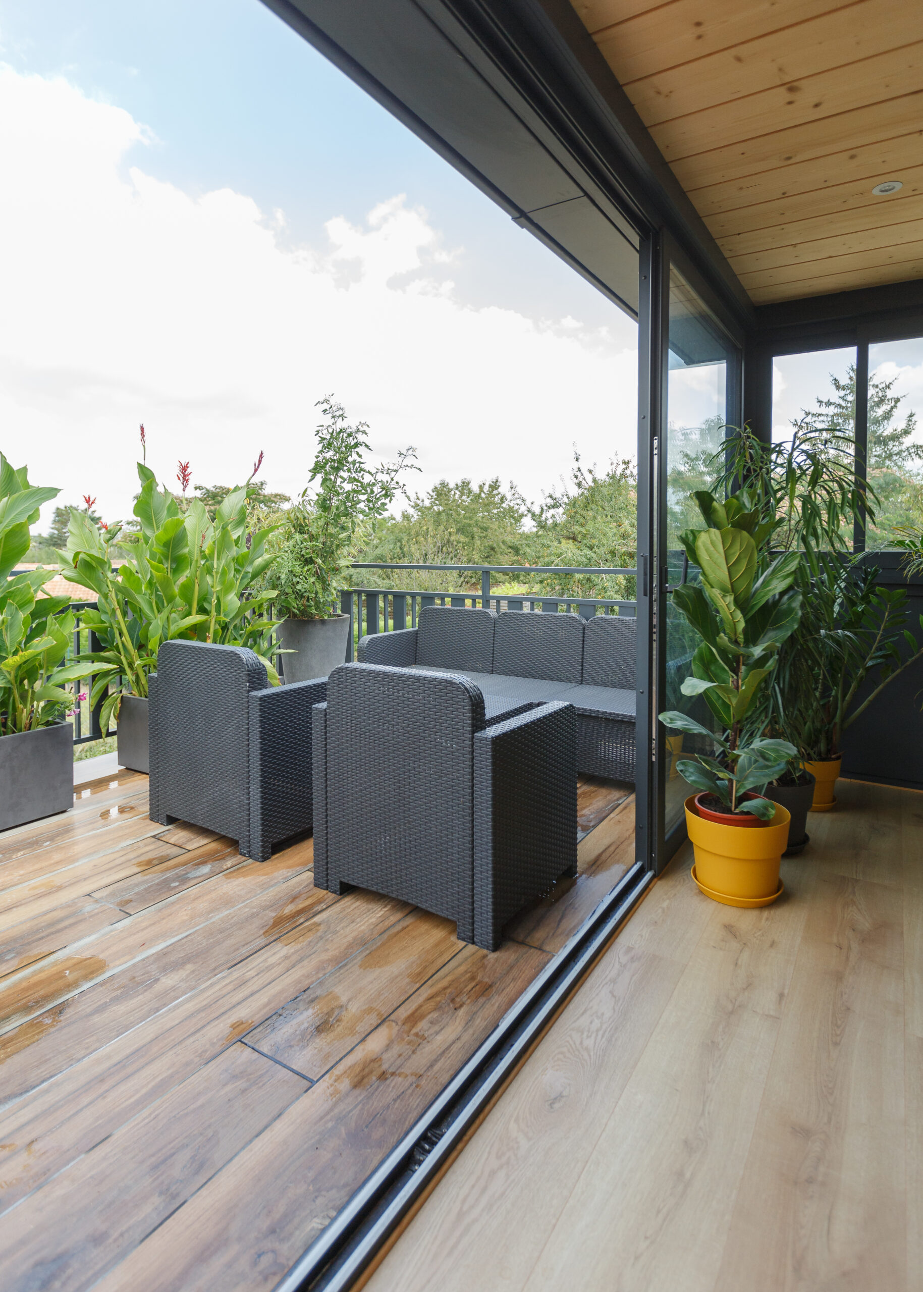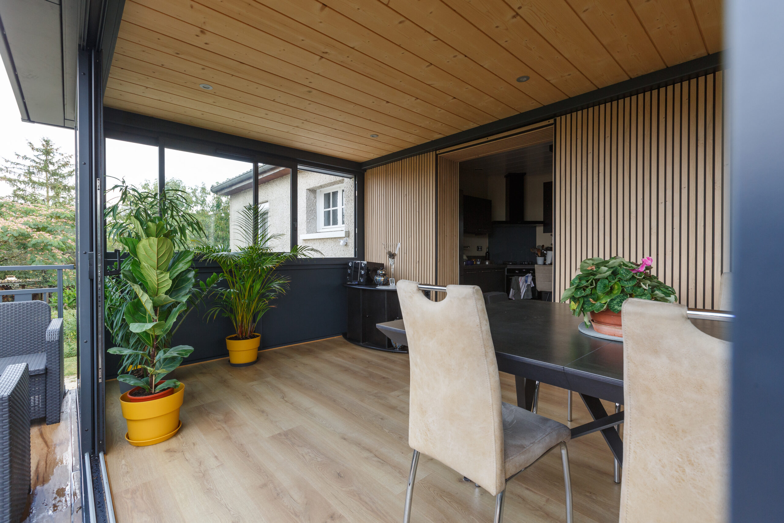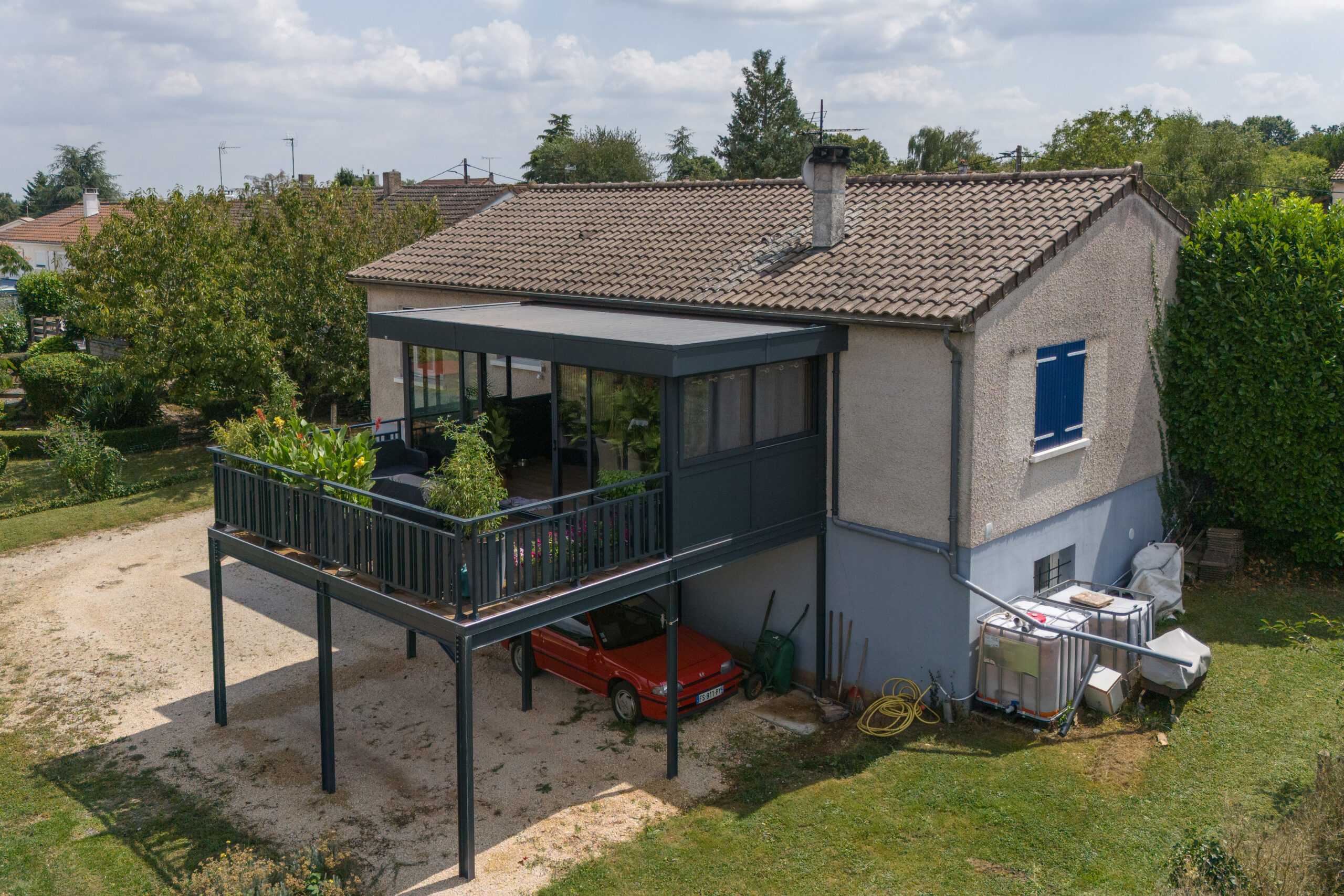 Extension pour une pièce de vie pour sur terrasse pilotis avec ouverture centrale pour profiter de l’extérieur en toutes saisons.