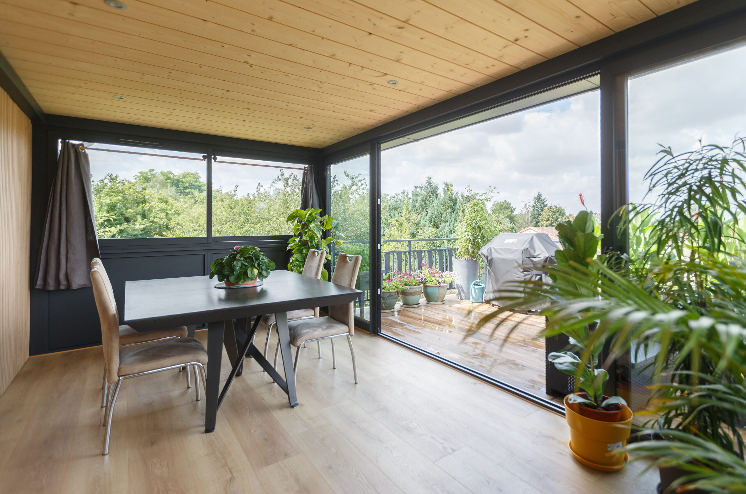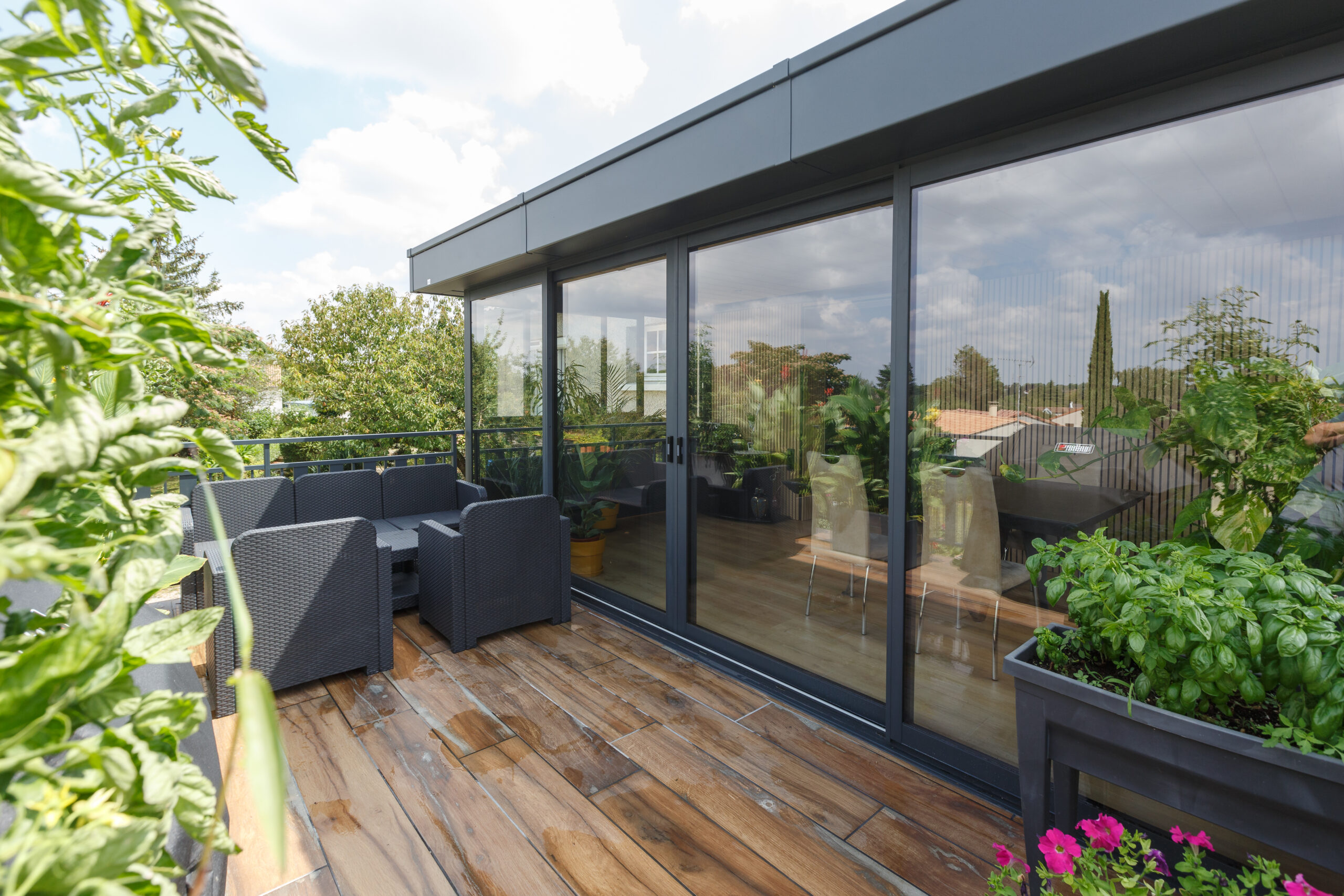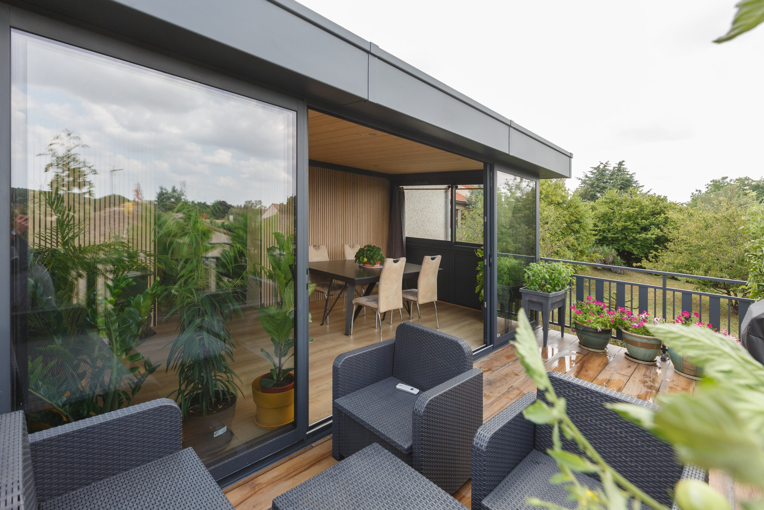 Extension pour une pièce de vie pour sur terrasse pilotis avec ouverture centrale pour profiter de l’extérieur en toutes saisons.