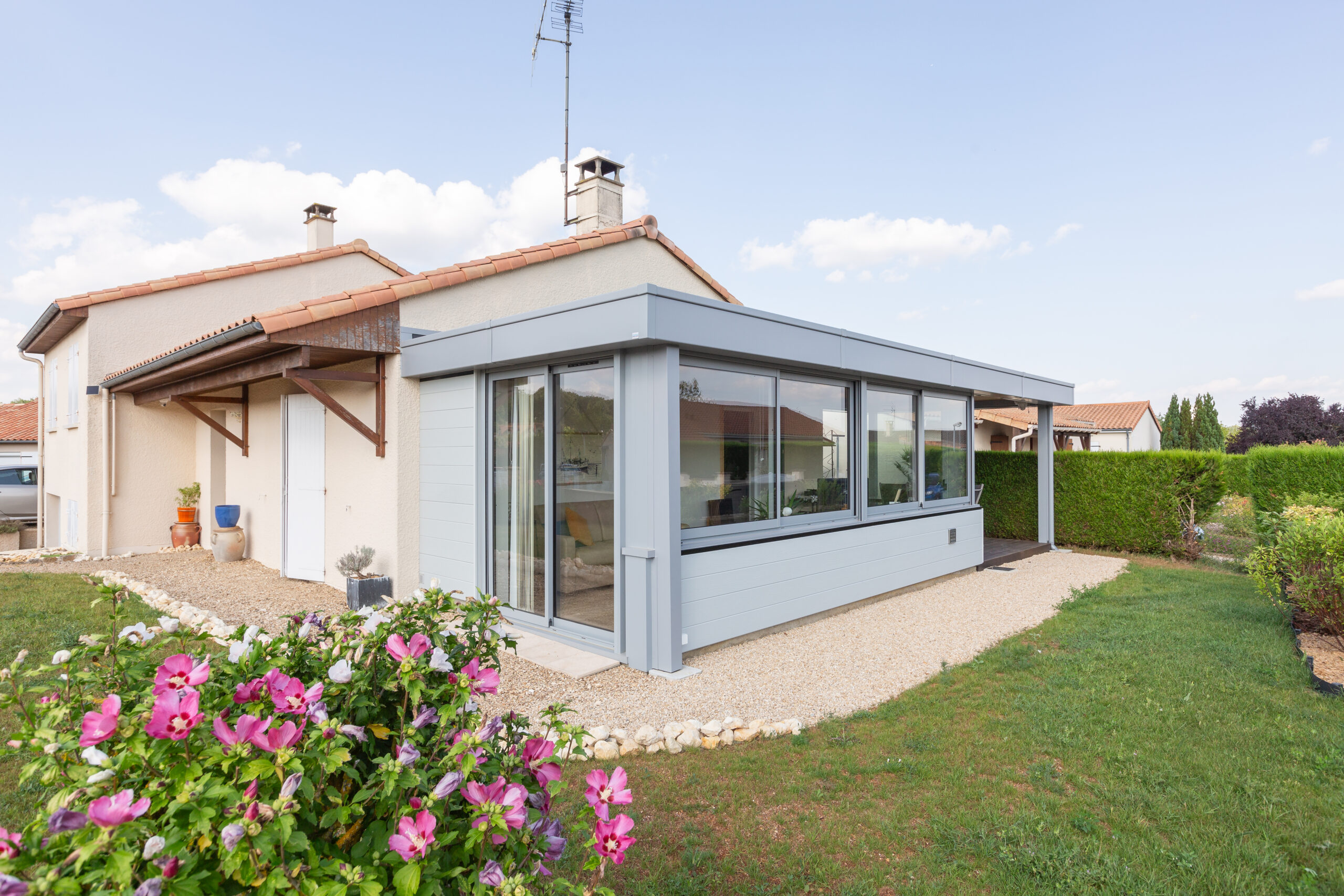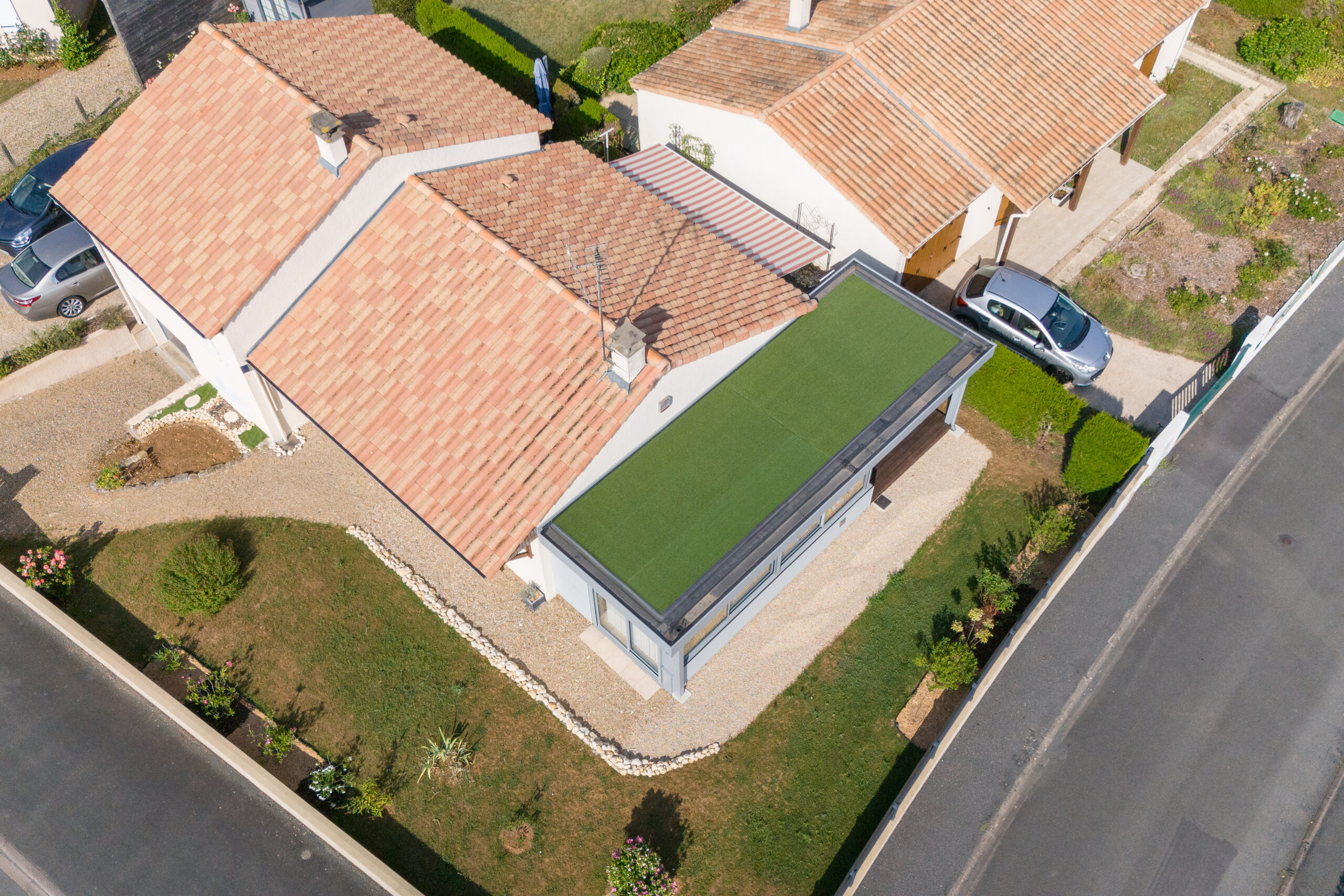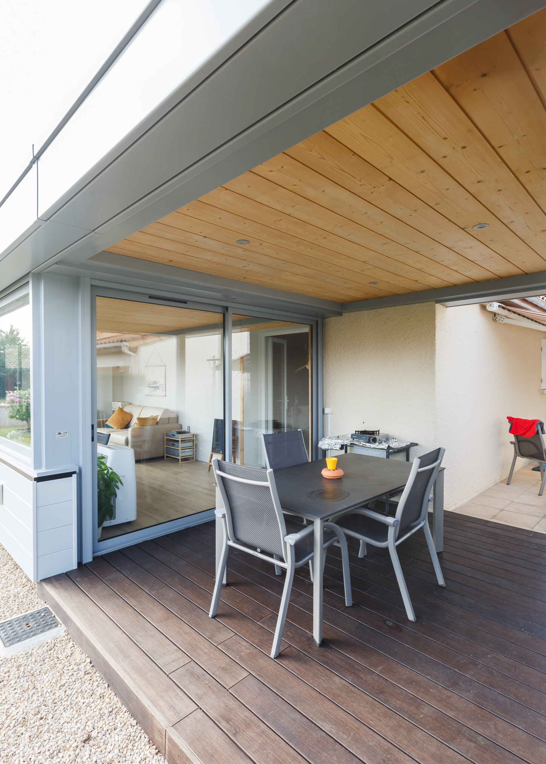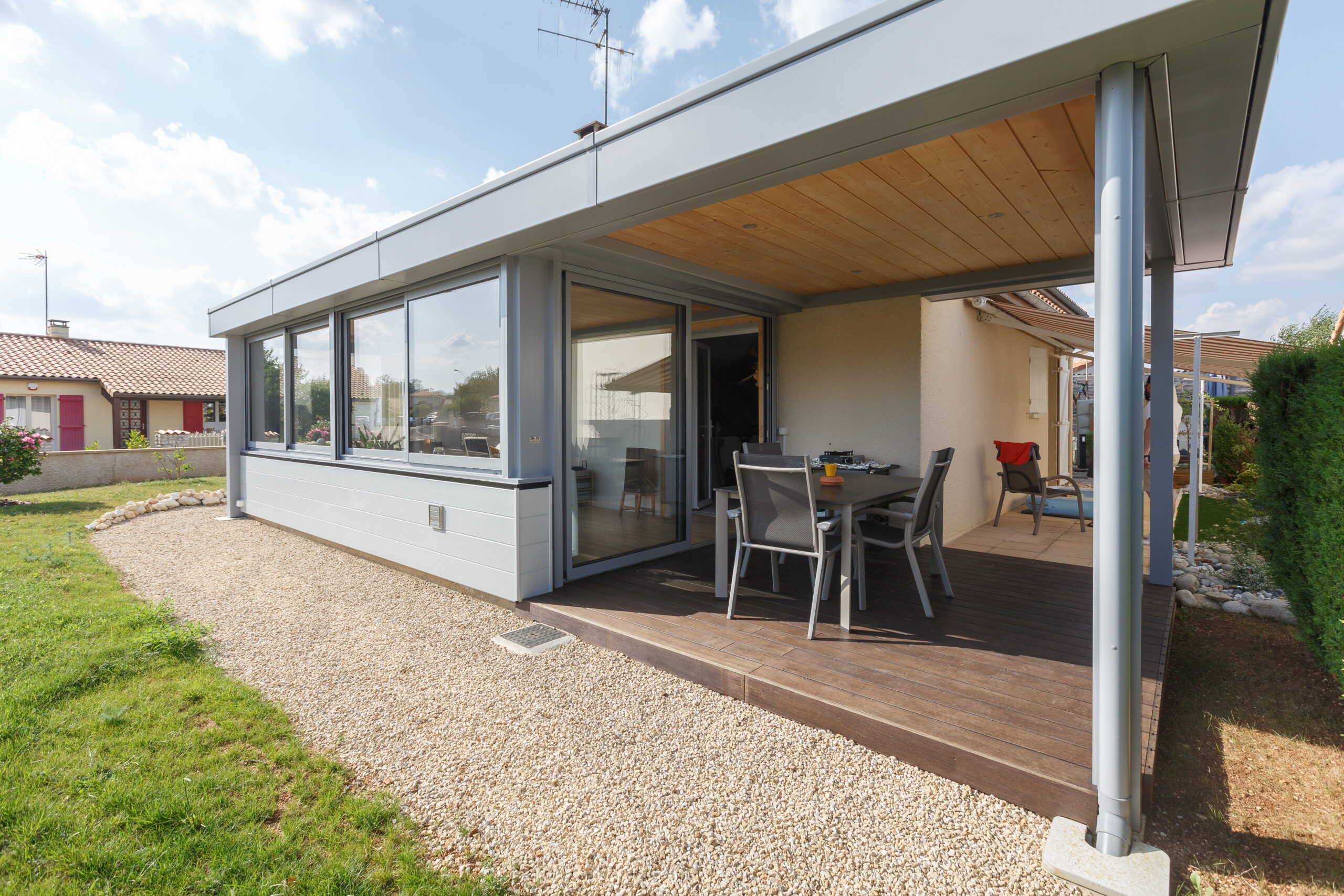 Extension + pergola intégrée pour une pièce de vie. Toiture finition synthétique, végétale ou minérale pour profiter de l’extérieur en toutes saisons.