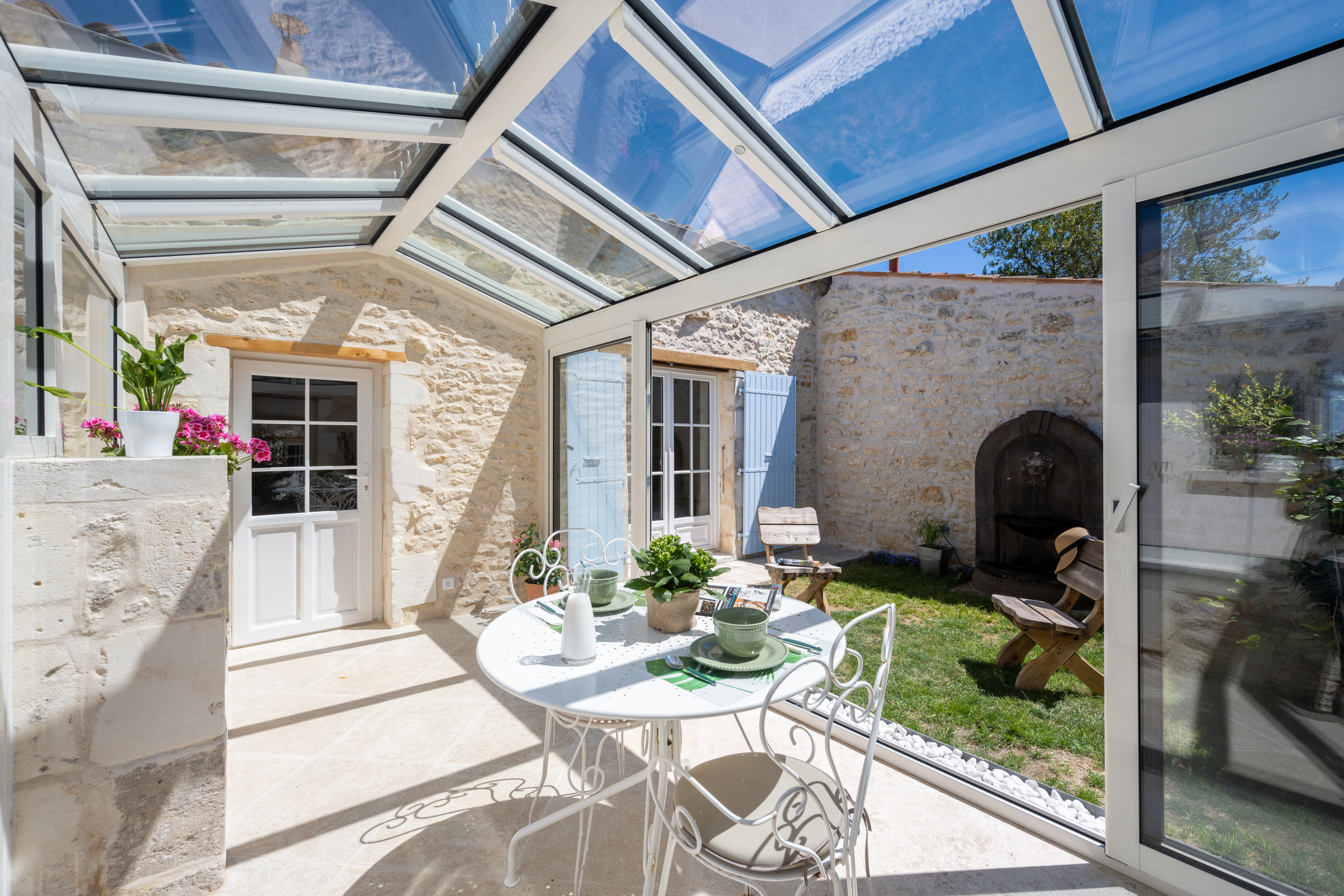 Création d’un beau jardin d’hiver type contemporaine qui assure la liaison entre deux habitations.